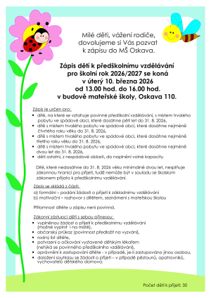 MŠ Oskava zve děti a jejich rodiče k zápisu dětí k předškolnímu vzdělávání pro školní rok 2026/2027, který se koná v úterý 10. března 2026 od 13.00 hod. do 16.00 hod. v budově mateřské školy. Formulář žádosti o přijetí k předškolnímu vzdělávání ke stažení na webu MŠ "Dokumenty - ke stažení".