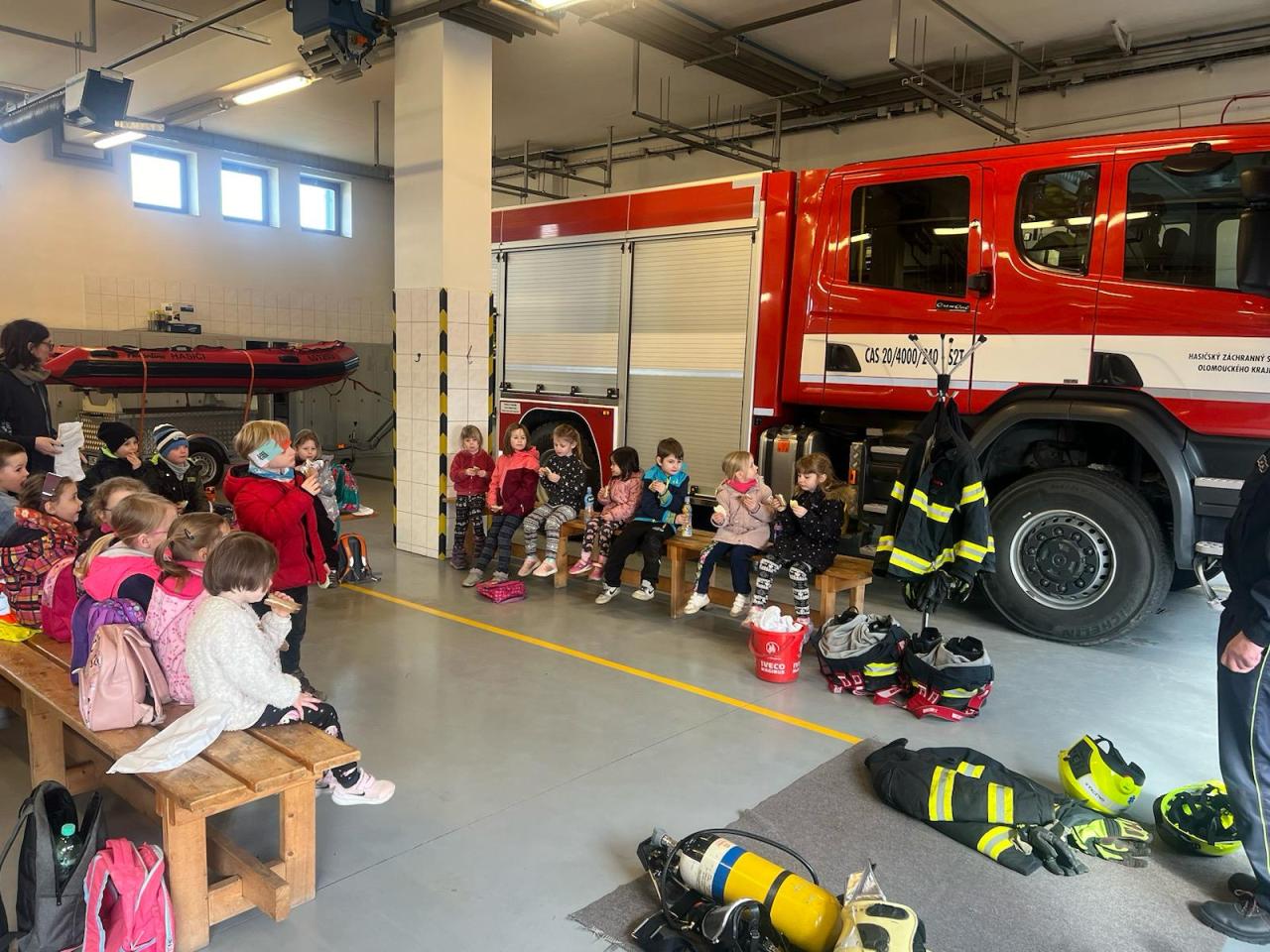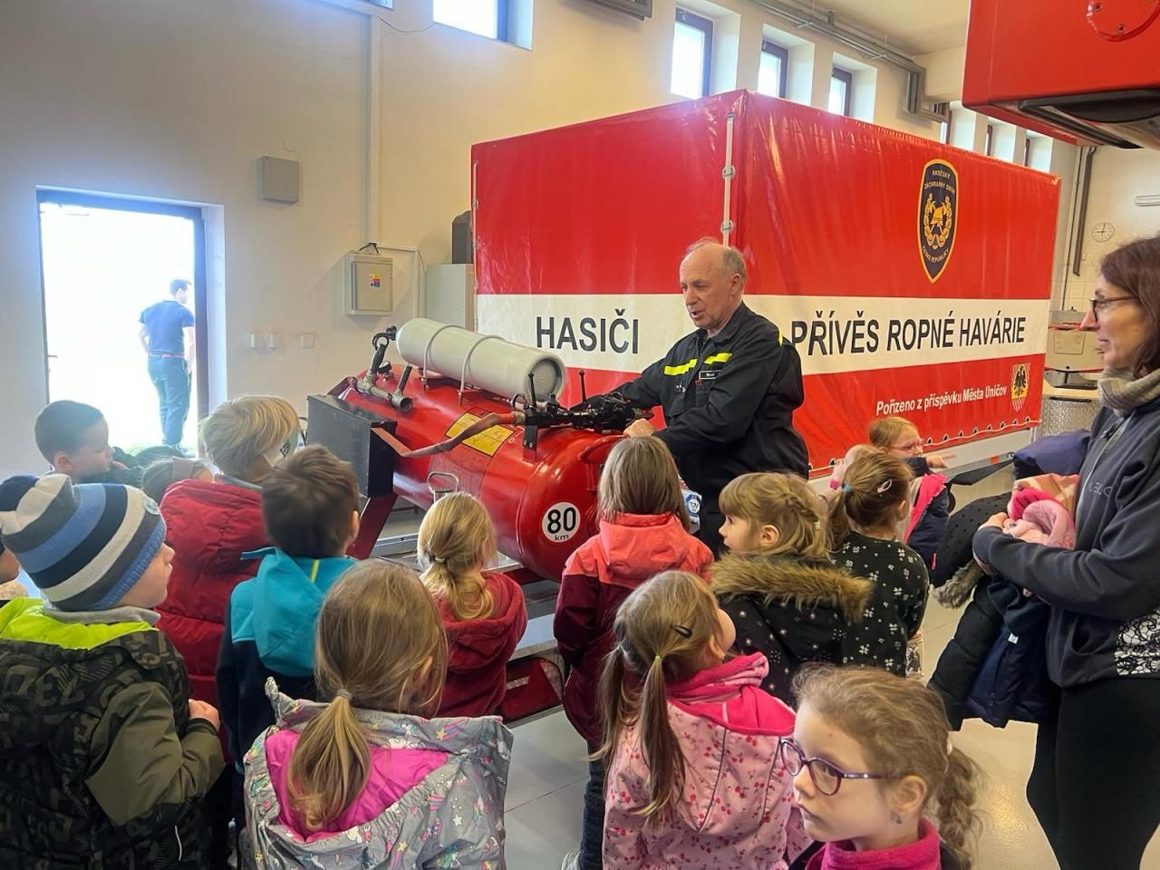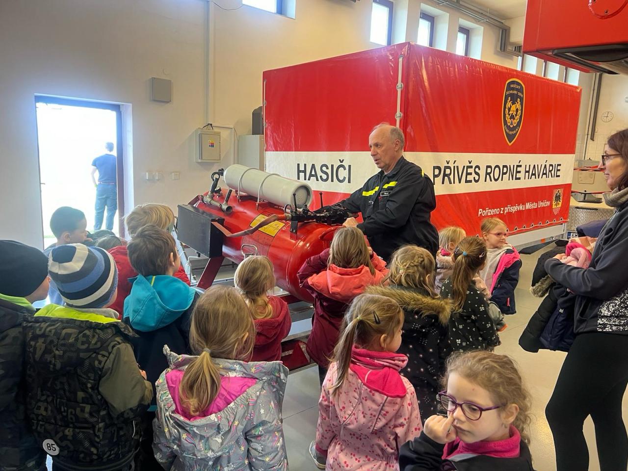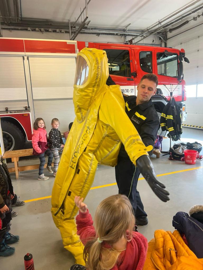 V rámci týdenního plánu „Povolání“ jsme se s dětmi vydali do Uničova na prohlídku tamní hasičské zbojnice. Naše dobrodružství začalo, když jsme byli přivítáni velitelem stanice, který nám věnoval čas a ochotně nám odpovídal na naše dotazy. Poté nás provedl celým areálem a představil nám různé typy hasičských vozidel, speciální oděvy a techniku potřebnou k jejich práci. Vrcholem naší návštěvy bylo, když jsme měli možnost zkusit si na vlastní kůži, jak to je být hasičem. Byli jsme vybaveni hadicemi a pověřeni úkolem stříkat vodu na umělý cíl. Celkově byla naše návštěva hasičské stanice nejen zábavná, ale také poučná.