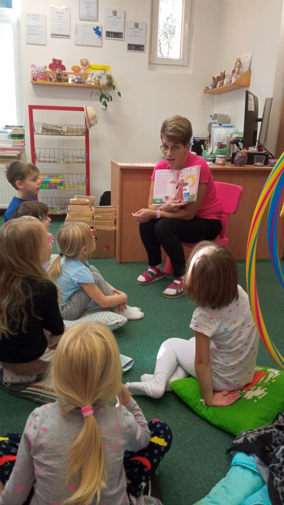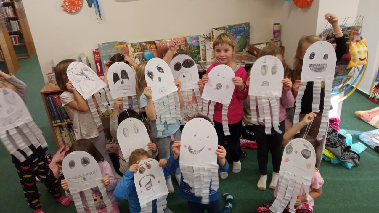 Paní knihovnice nás úsměvem uvítala, představila nám knihovnu a přečetla kousek z nové krásně ilustrované knížky Liška Šiška ve školce a velmi pěkně si o něm s dětmi popovídala. A protože děti byly šikovné, zvídavé a pozorné, za odměnu si vyrobily roztomilého ducha k nadcházejícímu halloweenu. Že se jim duchové povedli?