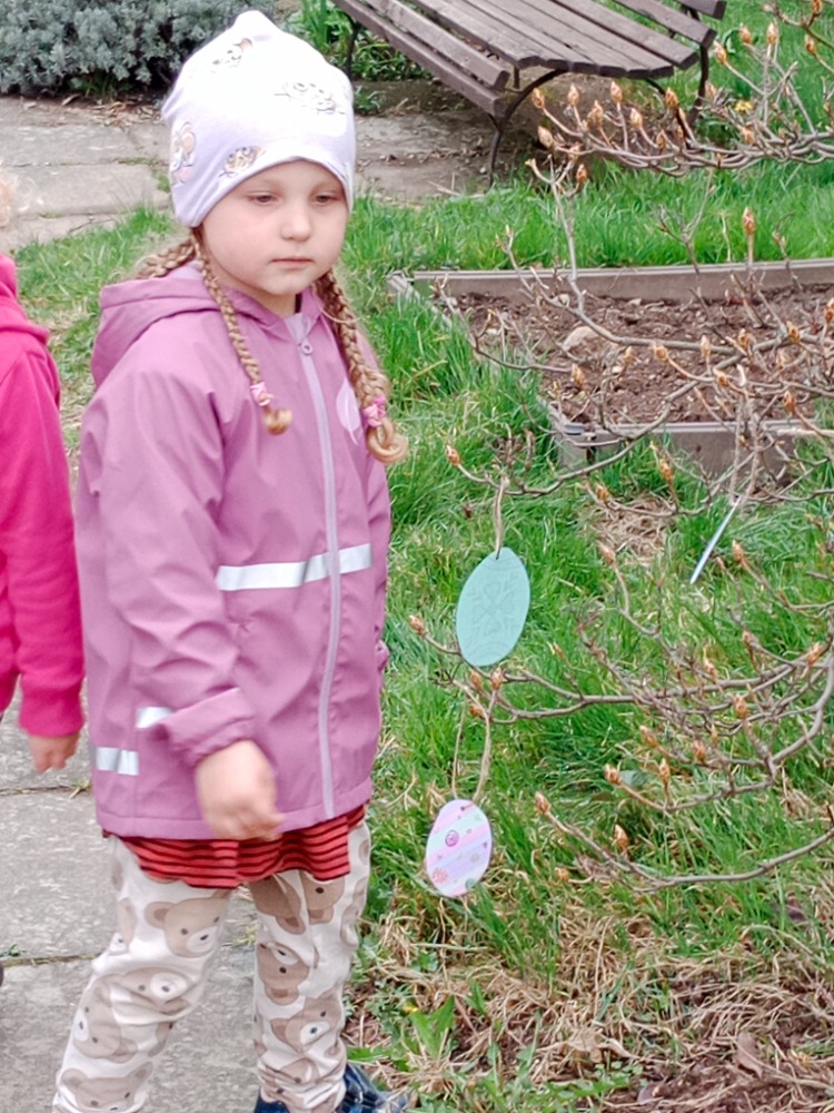 Po úklidu zahrady s rodiči si děti otevřely zahradu zdobeným klíčem a ozdobily si keře barevnými vajíčky. Nejvíce si užívaly zábavu na pískovišti, na kterou se už dlouho těšily.