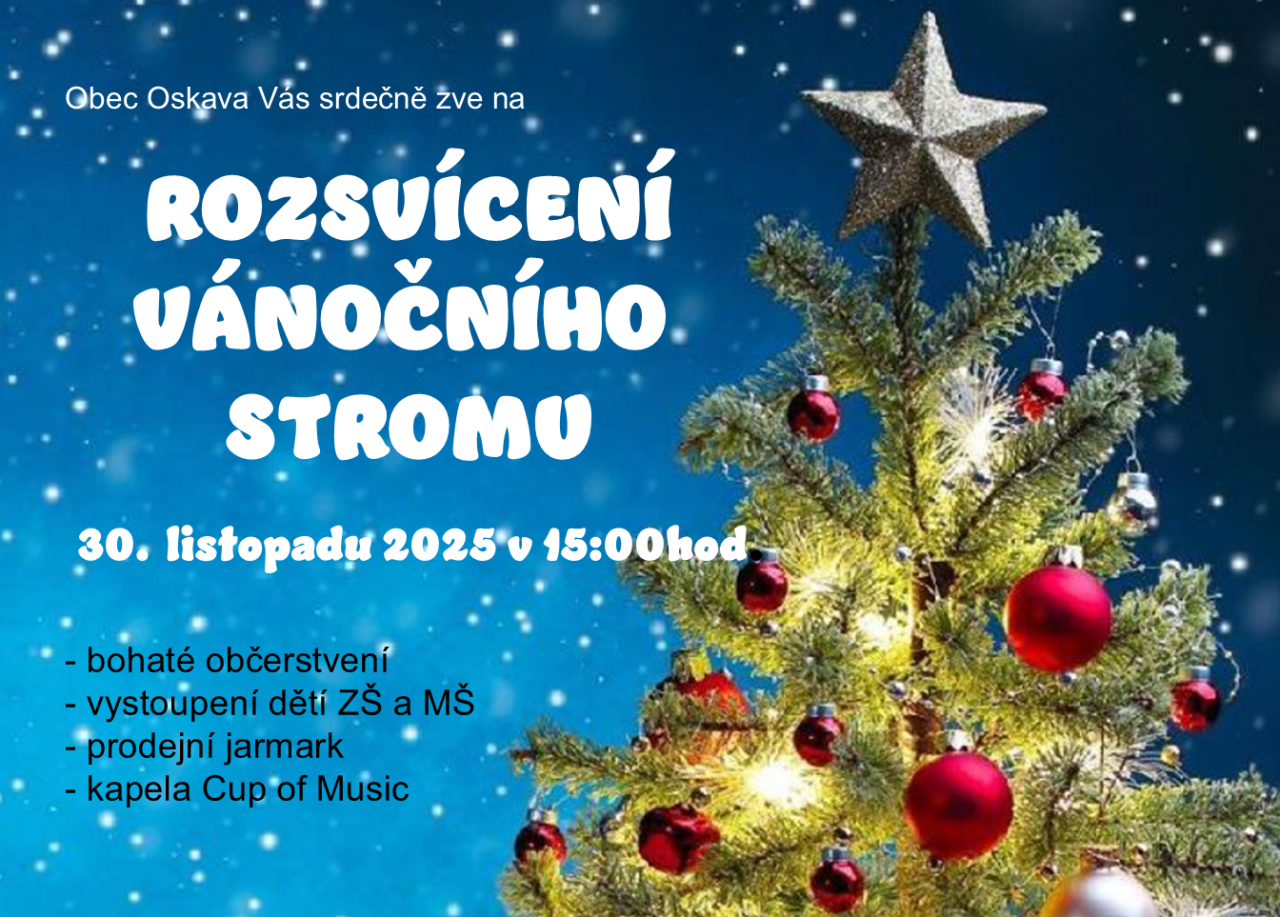 Obec Oskava a MŠ Oskava Vás srdečně zvou na slavnostní rozsvícení vánočního stromu, které se uskuteční v neděli 30.11.2025 od 15.00 hodin. Součástí programu bude vystoupení dětí z naší mateřské školy. Těšíme se na Vaši účast.