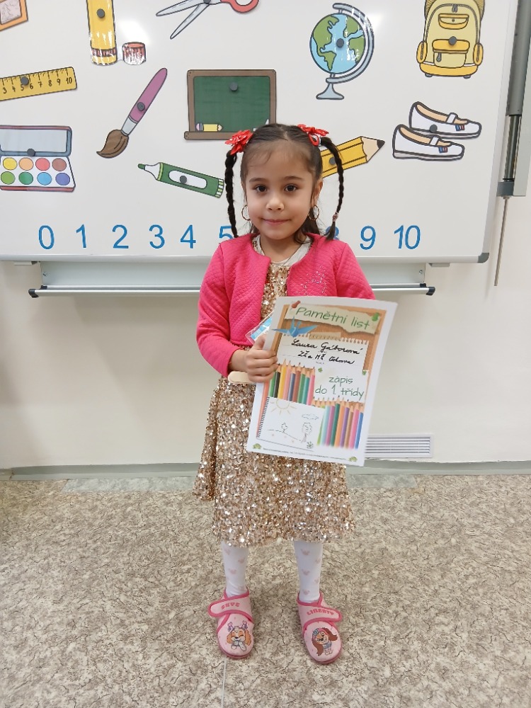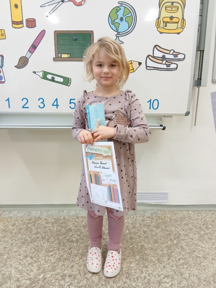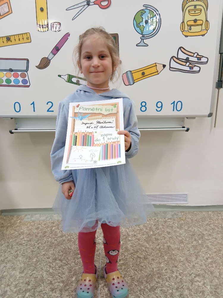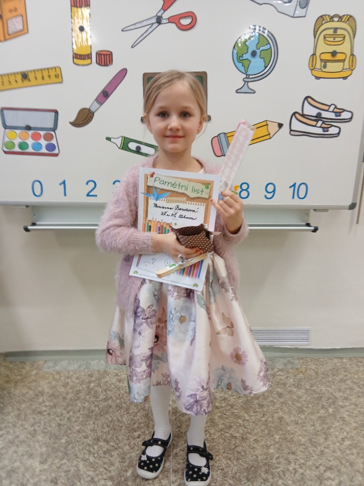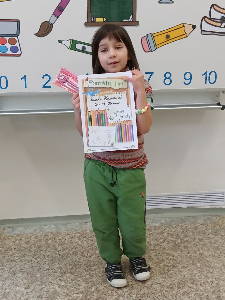 Za své snažení a šikovnost byly odměněny malou pozorností a pamětním listem, který jim bude připomínat den zápisu. Malou drobnost na památku dostaly také od paní učitelky z mateřské školy Aleny Urdové, která děti při zápisu podporovala a dodávala jim odvahu.