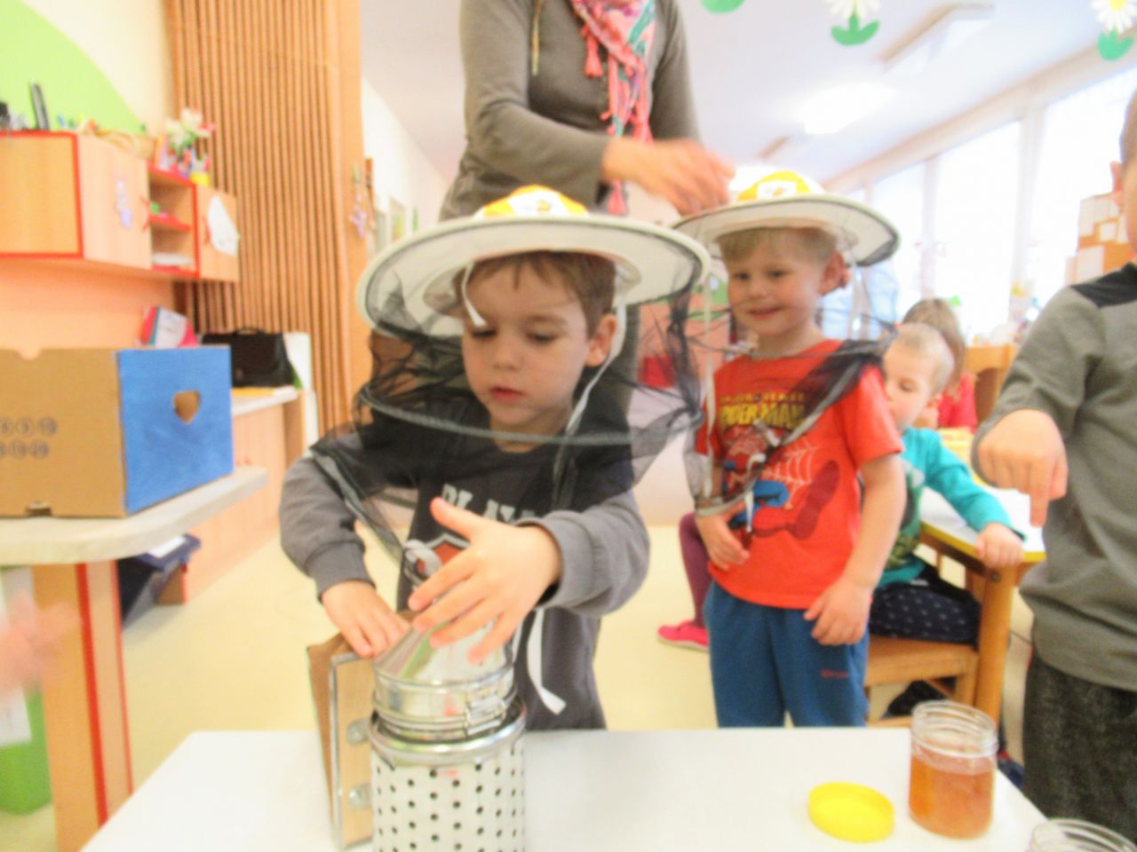 Kdo všechno bydlí v úle? Jak si včelky rozdělují práci? A mnoho jiných poznatků děti získaly z programu paní Pacovské ze společnosti Děti na větvi.