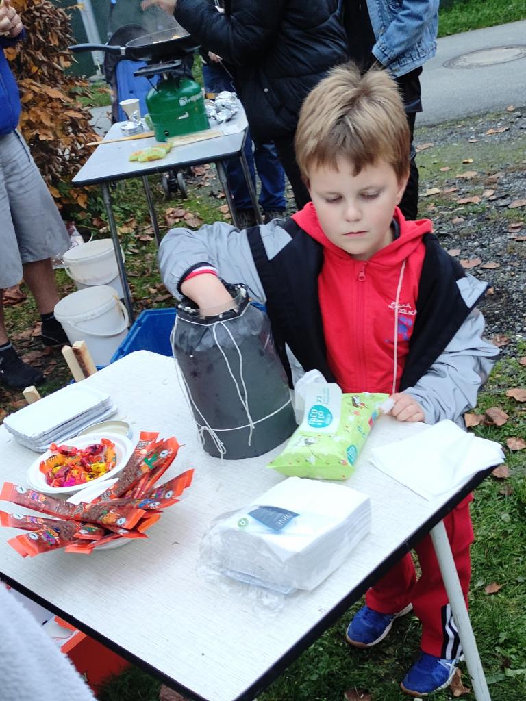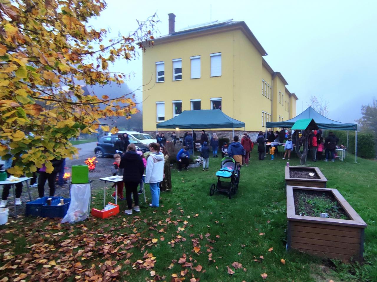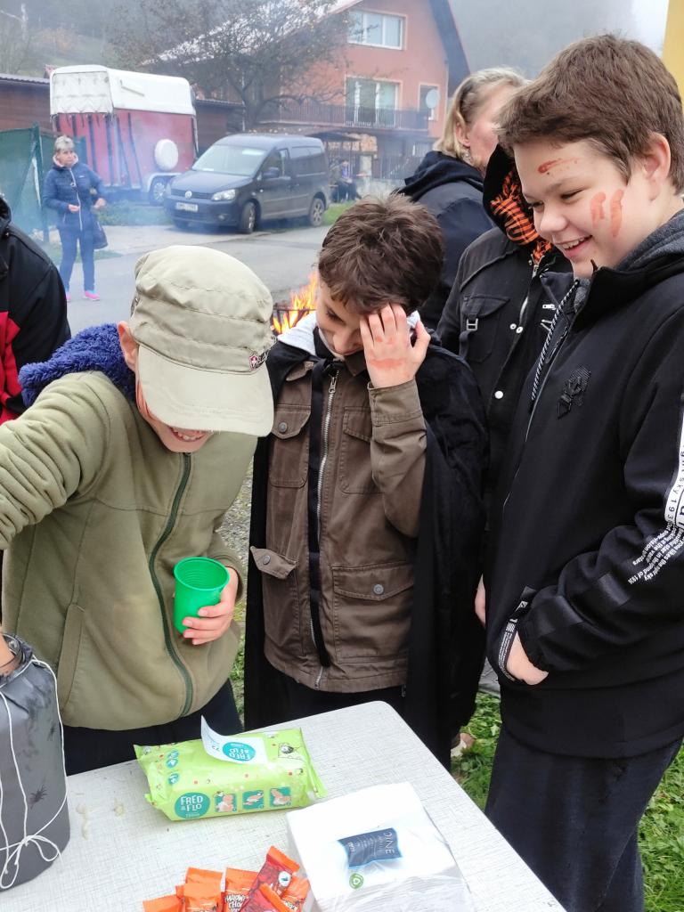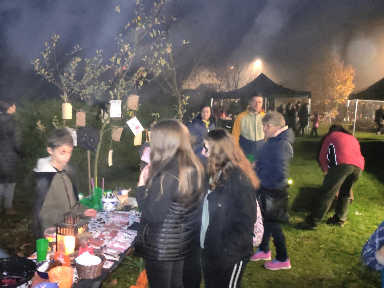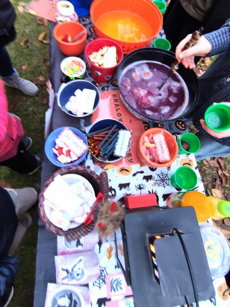 Do příprav i realizace se aktivně zapojili rodiče našich žáků, kteří pomohli nejen s technickými záležitostmi, ale podíleli se i na vlastním programu. V pondělí odpoledne vyrostly na naší školní zahradě dva velké stany, z nichž jeden sloužil pro dětské tvoření, druhý se stal vyhledávaným místem k občerstvení. Z kulinářské dílny pana Radka Pořízka jsme tu mohli ochutnat vynikající dýňovou polévku, párek v rohlíku, lahodný jablečný mošt, k opečení na ohni tu čekaly připravené špekáčky. Ani kávovar nezahálel, dospělým se tu podávala vynikající káva. K té nechyběly ani krásně zdobené zákusky, které napekly maminky našich žáků. A to nebylo všechno! Speciální lahůdkou byly v ohništi pečené brambory, příjemnou změnou chuti pak mohla být jablka v karamelu.