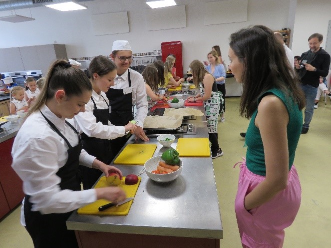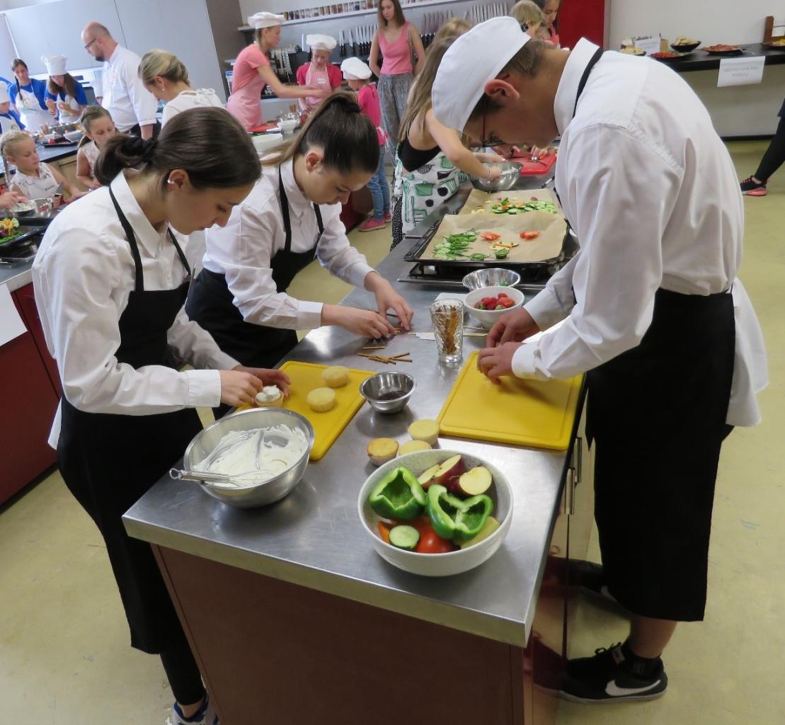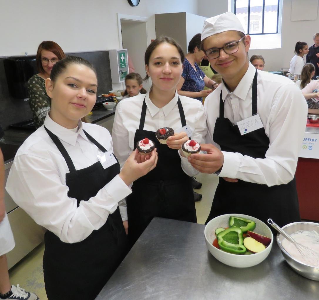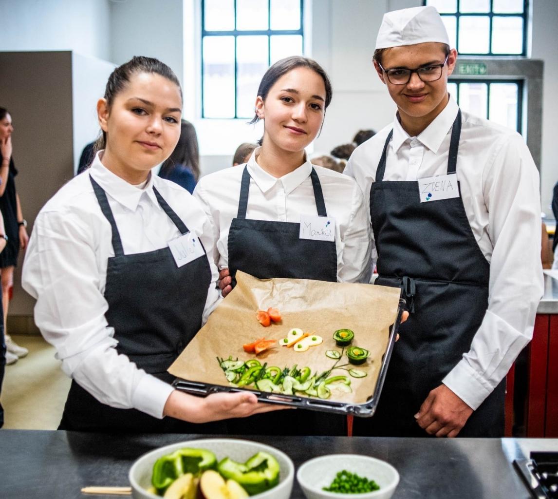 Pátek 27. 5. byl tím dnem, kdy naše trio s názvem Oskaváci předvedli vše, co v sobě našli. V kuchyni nejde jen o vaření, ale i hygienu, pořádkumilovnost, systematickou týmovou práci, umění dělat rychlá rozhodnutí a spoustu dalšího. Čistota z Oskaváků zářila už při nástupu: sejmuté šperky, bílé košile, černé zástěry, pevně sepnuté vlasy a další drobnosti působily velmi profesionálně. Nutno podotknout, že si Oskaváci po odstartování prvního úkolu jako jediní šli umýt ruce (což jsem jim zapomněl říct)!