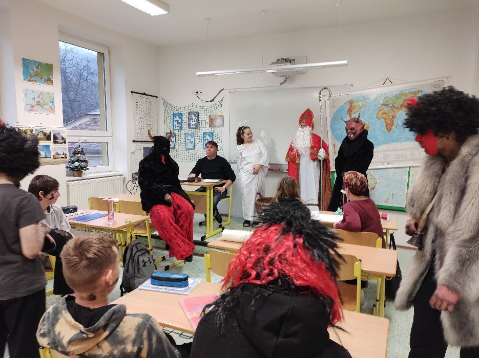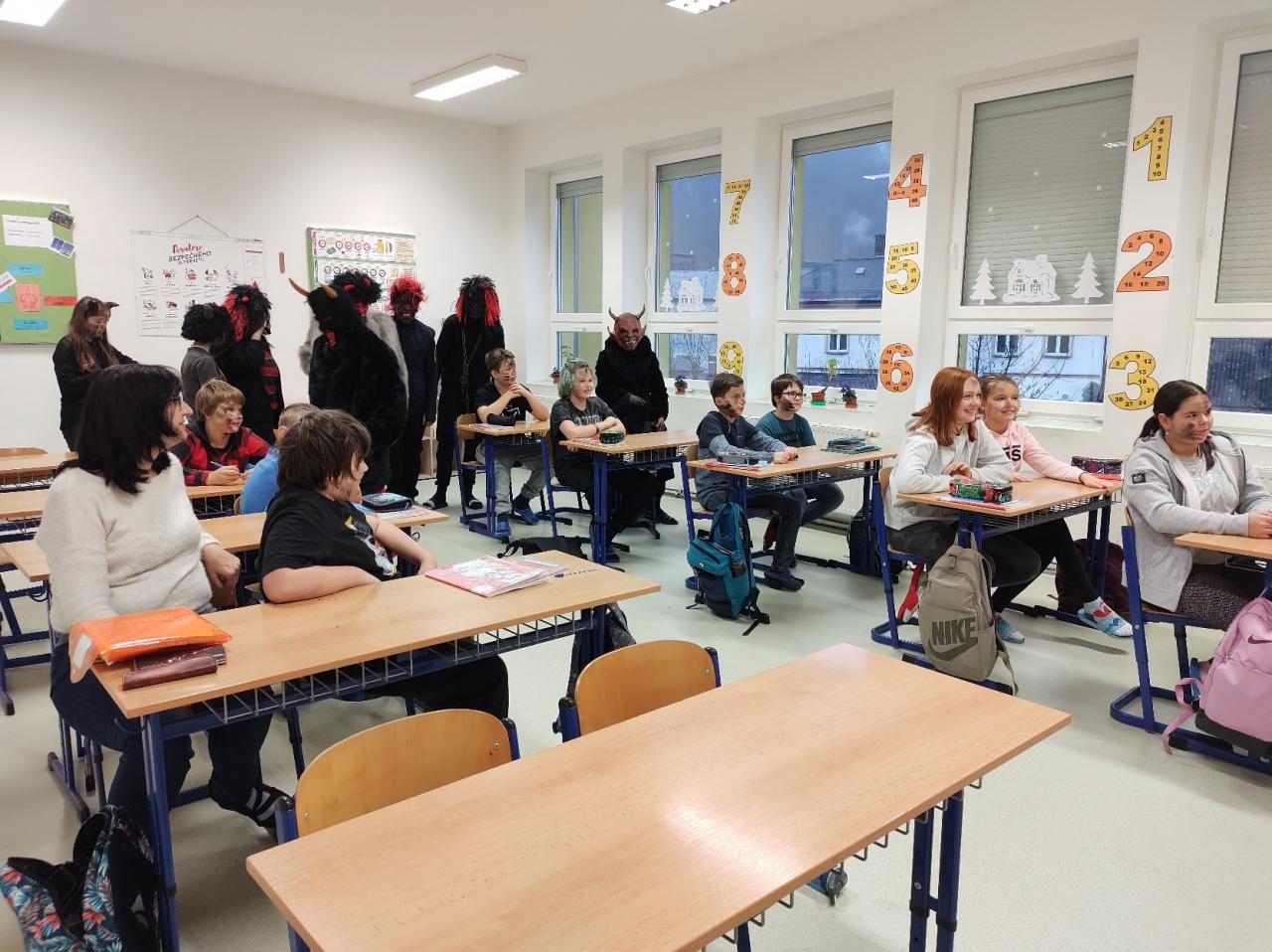 Tento ročník však působil o něco živěji než v letech minulých, jelikož čertů se do základní školy dostavilo mnohem více. V čele se vstřícným Mikulášem a milým andělem po jeho boku se skupina chlupatých a umouněných ďáblů prohnala jednotlivými třídami, až se z jejich huňatých kožichů zvedala oblaka uhelného prachu. Ani jednoho žáka nám však žádné čertisko neodneslo, ti je naštěstí uchlácholili pěknou písní nebo básní. Pro výstrahu do budoucna si však čerti neodpustili pomazat některé „hříšníky“ černým mourem.