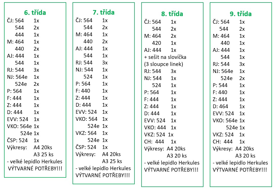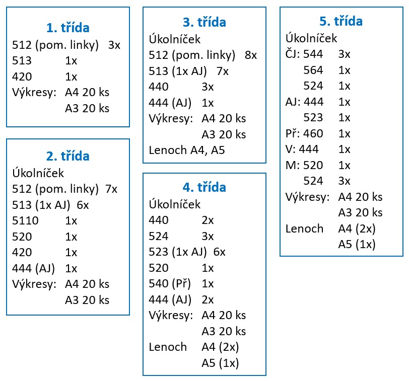 Seznamy sešitů, které je třeba zakoupit do jednotlivých ročníků.