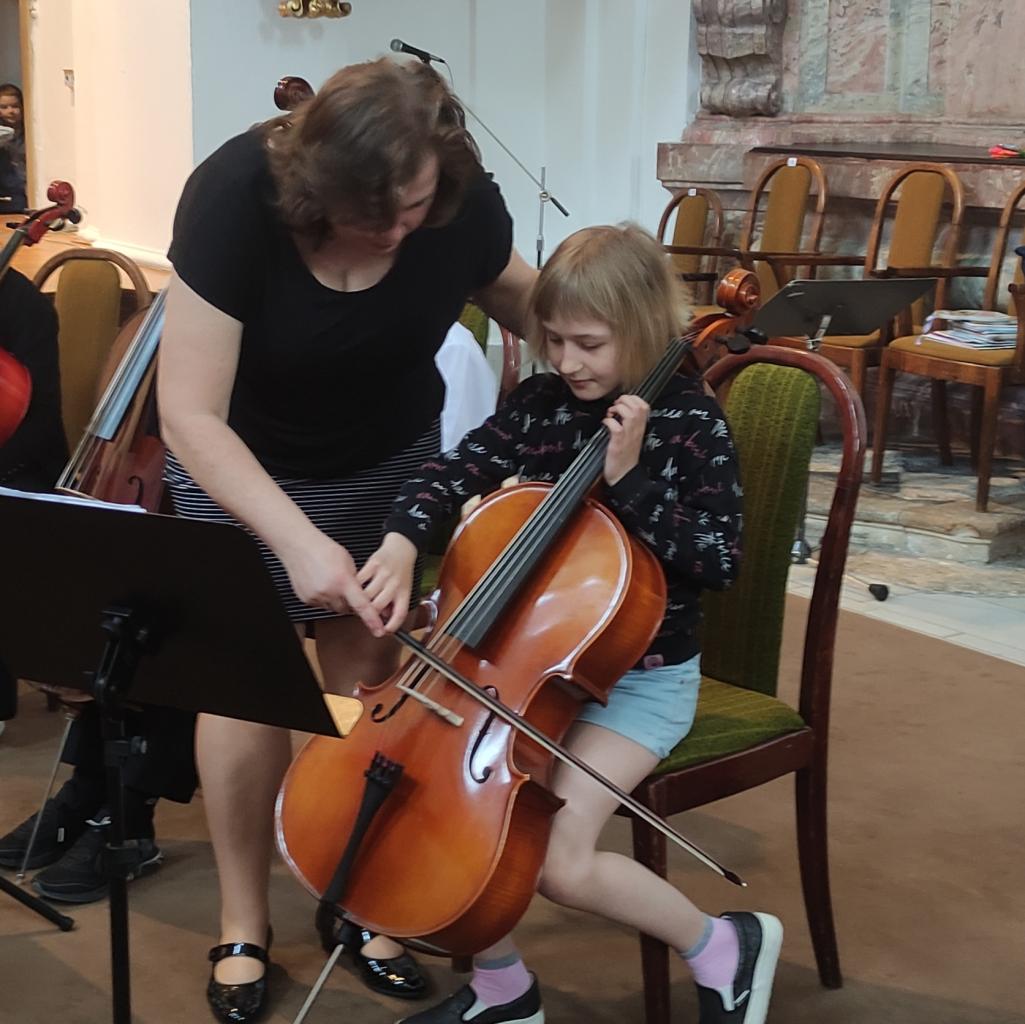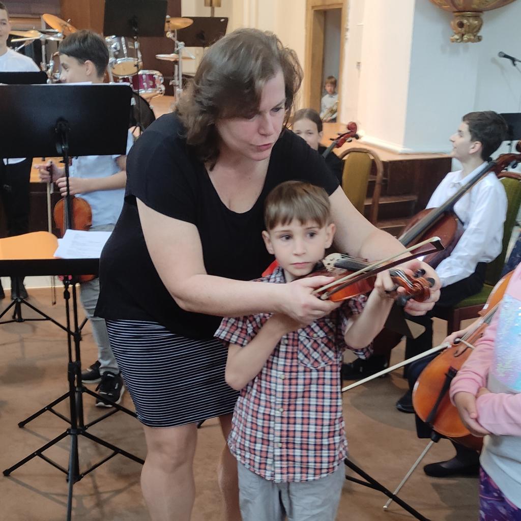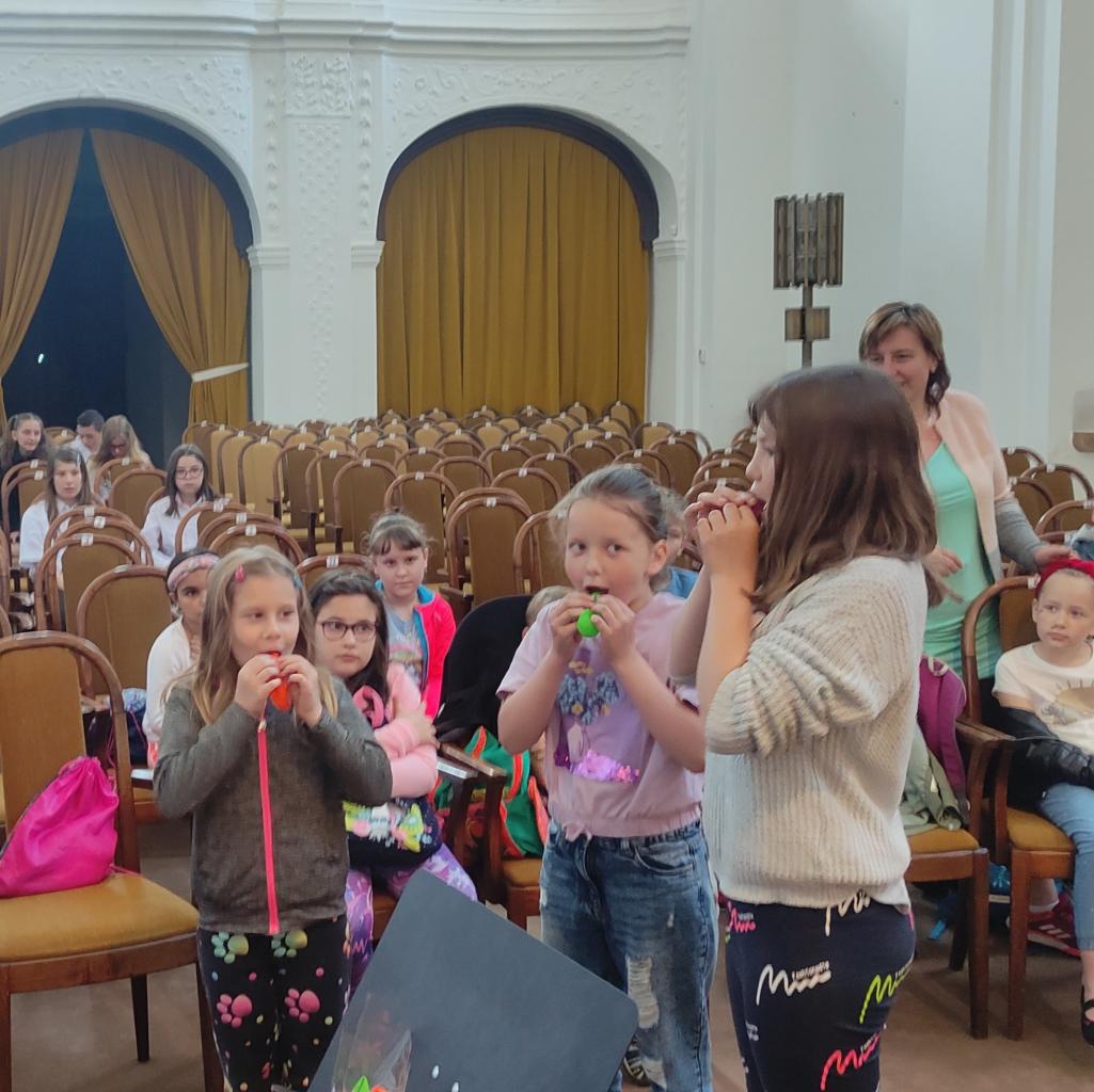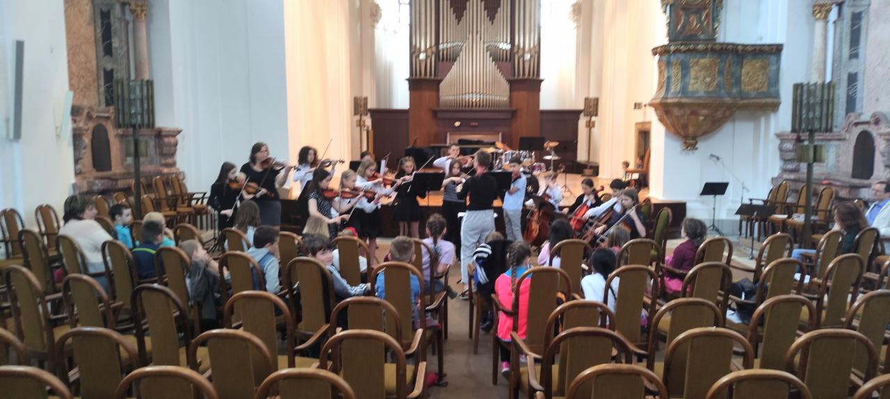 Koncertem nás provázel p. uč. Charfreitag, který měl na děti připraveno spoustu všetečných otázek, ale také všechny překvapil svými vtipnými soutěžemi. Během hodinového koncertu si děti poslechly dětský smyčcový i dechový orchestr, sólovou hru nejmenších žáků na tubu, violoncelo i další hudební nástroje. Měly možnost prohlédnout si většinu hudebních nástrojů a někteří si dokonce zahráli na housle a violoncelo.