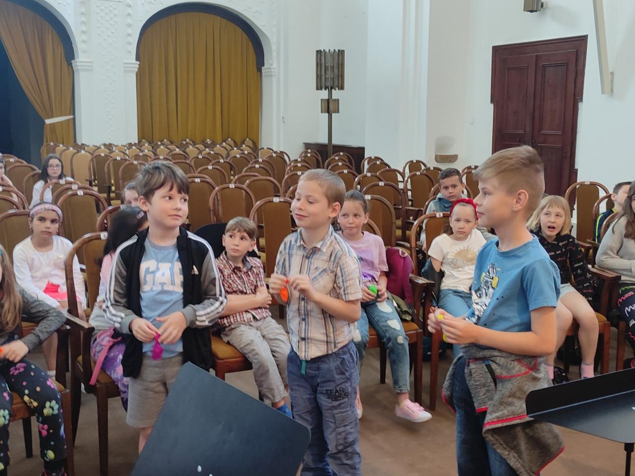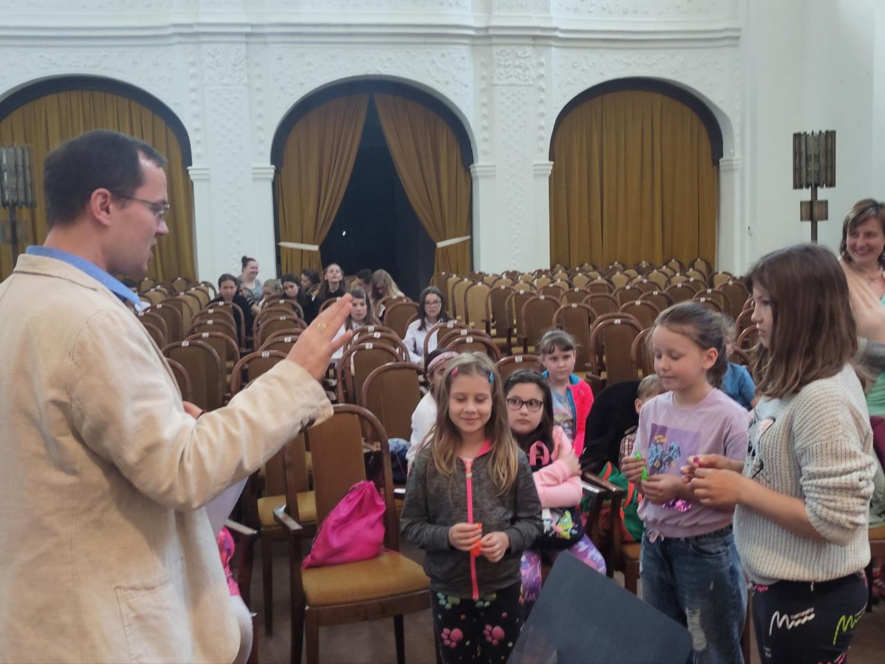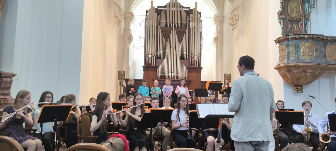Koncertem nás provázel p. uč. Charfreitag, který měl na děti připraveno spoustu všetečných otázek, ale také všechny překvapil svými vtipnými soutěžemi. Během hodinového koncertu si děti poslechly dětský smyčcový i dechový orchestr, sólovou hru nejmenších žáků na tubu, violoncelo i další hudební nástroje. Měly možnost prohlédnout si většinu hudebních nástrojů a někteří si dokonce zahráli na housle a violoncelo.